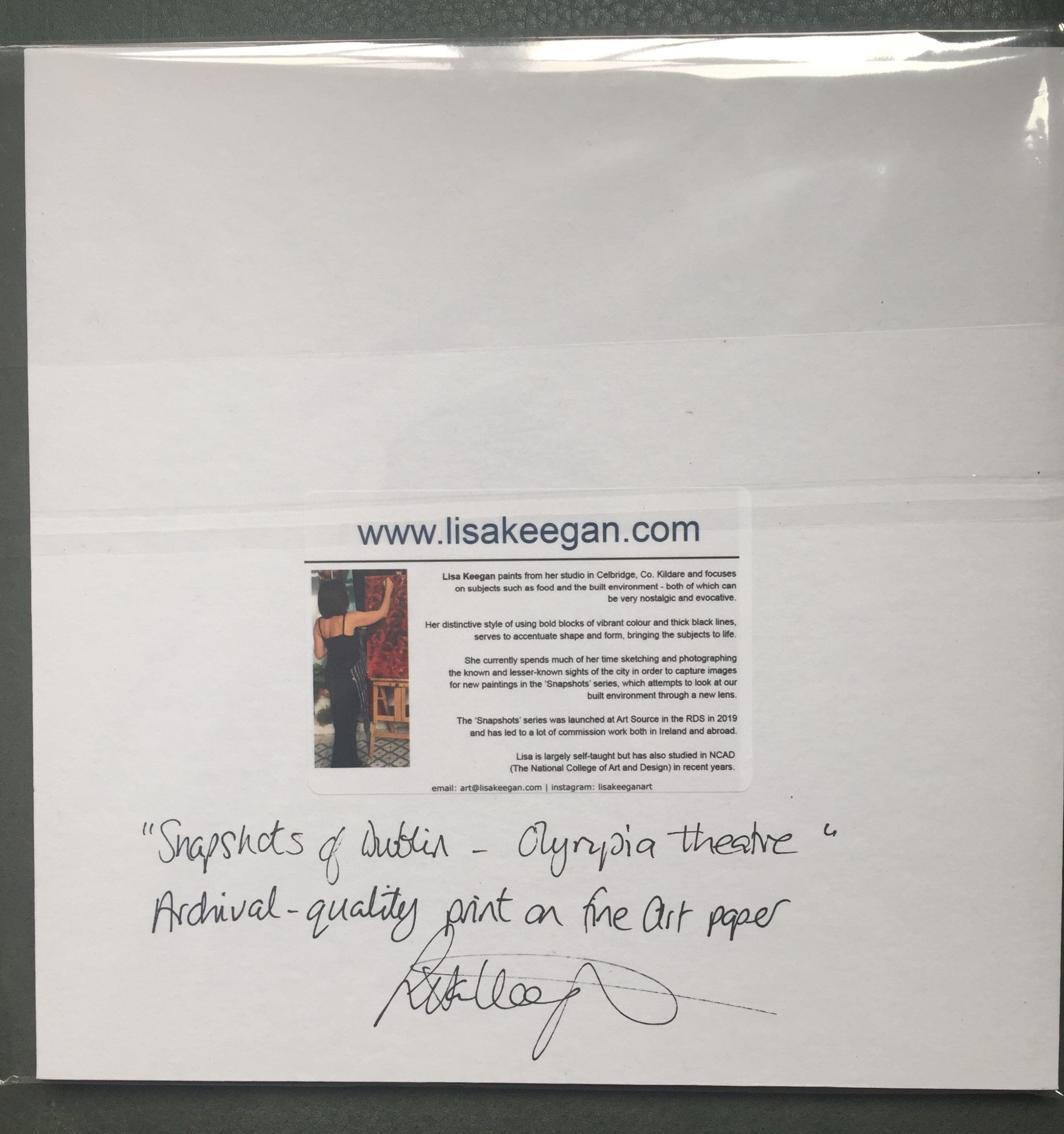 This is a 23cm x 23cm mounted fine art print on archival-quality paper. The print comes wrapped in plastic sleeve with artist bio and signature on reverse. Each print is hand-finished and signed before framing or shipping.