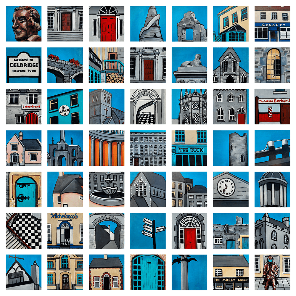 The Snapshots of Celbridge exhibition is a social media-based exhibition involving photographic contributions from the community under the hashtag #snapshotsofcelbridge. The main ‘Snapshots of Celbridge’ piece was originally planned to consist of 36 panels (painted depictions of contributed photos) but due to the number and quality of the submitted photographs, it has been increased to a 49-panel piece – my largest ‘Snapshots’ yet!