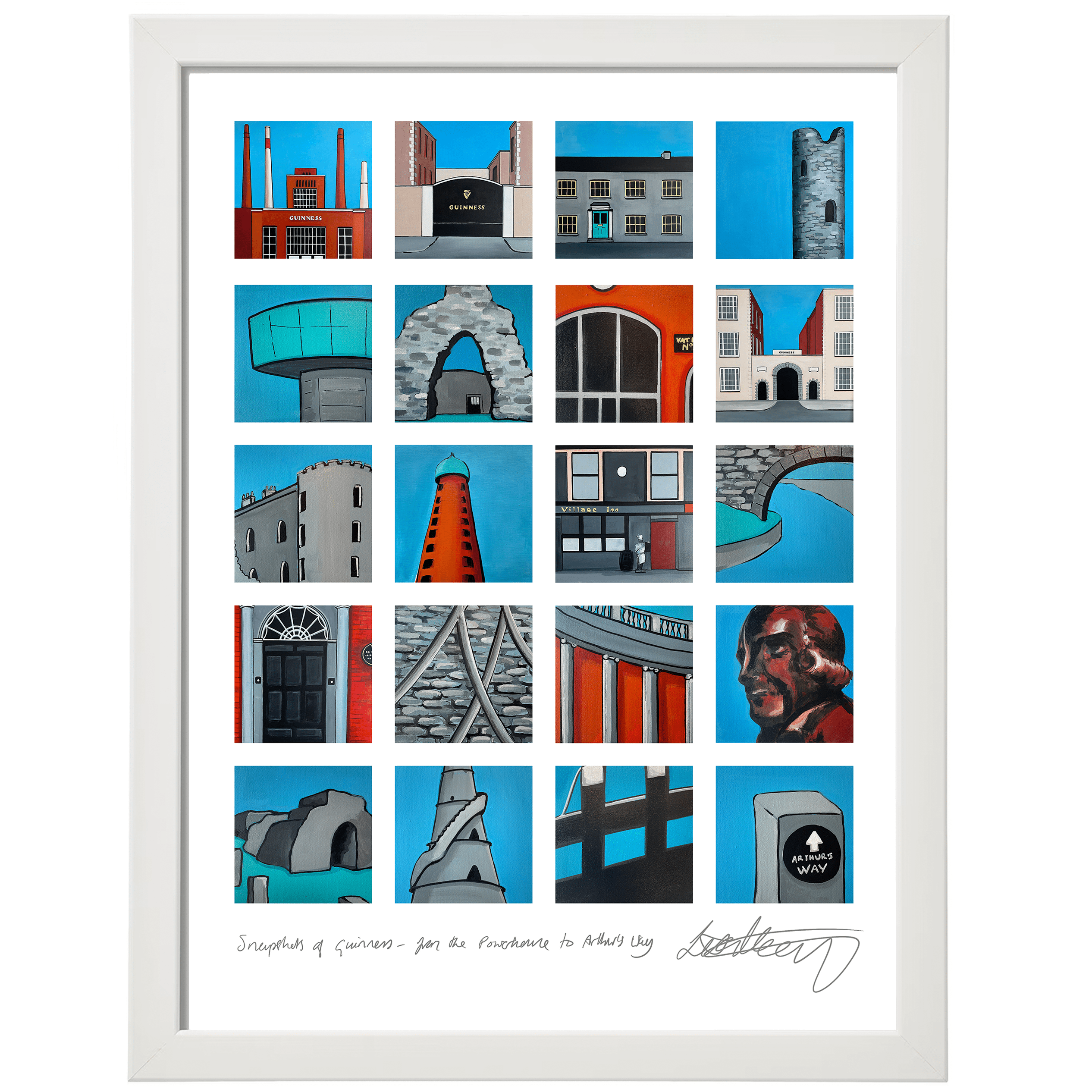 This 20-panel print features significant locations in the life of Arthur Guinness in both Dublin and Co. Kildare. These locations include the architecturally significant Guinness Power Station (now Roe & Co Whiskey), the birthplace of Arthur Guinness in Celbridge, Co. Kildare and also his final resting place in Oughterard Cemetery.